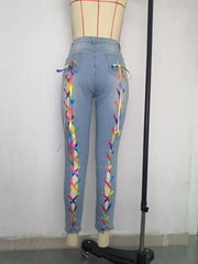 - Our "Rainbow Tie-Up Jean's" Is A Twist On Fashion, Showing A Multi Color Lace Up Jean From The Back, Fitted & Stretchable!